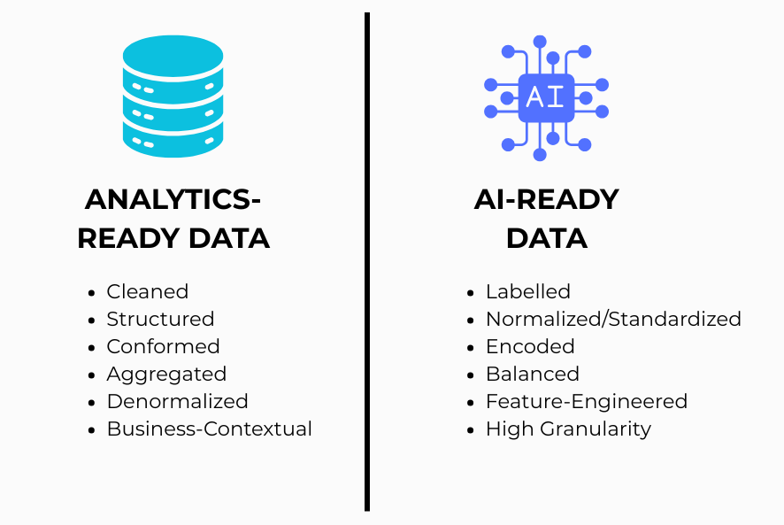 Confusing analytics-ready data with AI-ready data—or vice versa—can lead to inefficient workflows and poor outcomes. For example: